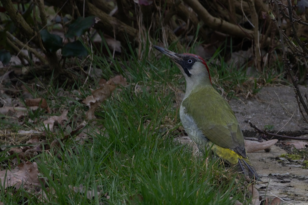 Mein Nymphensittichhahn war sehr unruhig – oft sind dann größere Vögel in der Nähe, die er nicht so mag. Heute war es ein Grünspecht, der im Garten nach Nahrung suchte. Grünspechte fressen Ameisen, die im Boden leben. Dieses ist ein Weibchen. Das erkennt man an dem einfarbigen schwarzen Fleck am Kopf – bei Männchen ist noch ein bisschen Rot dabei. Ich habe viele Fotos gemacht – dieses gefällt mir am besten.